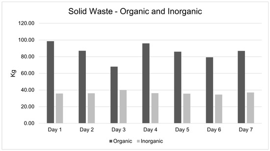 The analysis also considered the composition of the residues in organic and inorganic matter (Figure 7). It is observed that there is a higher concentration of organic waste, with a higher incidence on Day 1. Another fact is the stable values on inorganic solid waste.