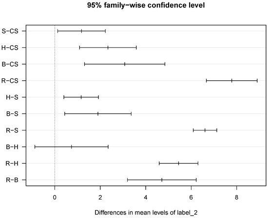Figure 8. Tukey test plot with mean difference for each pair of group. Note: S—store, CS—coffee shop, H—hotel, B—bakery and R—restaurant.