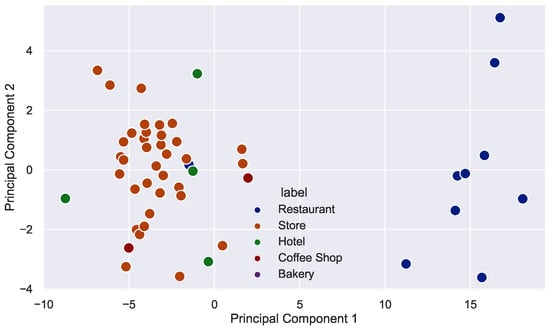 Figure 10 presents an analysis based on principal components. As we see in house analysis, it is possible to observe which are the most important variables to observe the variation of the data and identify how the data are grouped. It is observed that there is a difference between the behavior of the restaurant in relation to other commercial establishments. The other establishments are grouped in terms of volume of waste generated, while restaurants have a greater participation in Component 1. In this case, we use five principal components. The first principal component contains 79.56% of the variance, and the second principal component contains 5.26% of the variance. Together, the two components contain 84.82% of the information.
