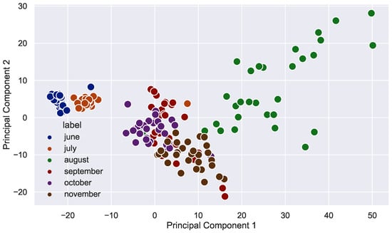 Figure 13 presents an analysis based on principal components. As we see in the other analysis, it is possible to observe which are the most important variables to observe the variation of the data and identify how the data are grouped. It is observed that there are three main groups: District 1 (June and July), District 2 (September, October and November) and District 3 (August). In this case, we use six principal components. The first principal component contains 46.63% of the variance, and the second principal component contains 11.10% of the variance. Together, the two components contain 57.73% of the information.