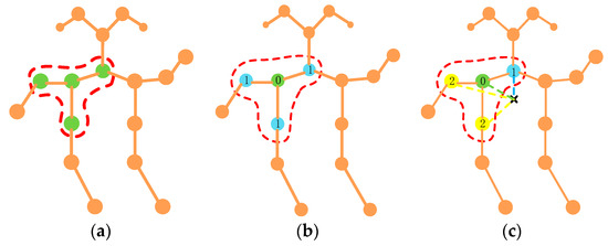 The spatial configuration partitioning strategy is shown in Figure 3c. This strategy can be broadly classified into centripetal and centrifugal motions according to the motion of the body parts. Take the bone center of gravity as the reference point, which is indicated by a black cross. The B ( v t i ) is divided into three regions: (1) the root node itself (green dot); (2) the centripetal set (blue dot)—the neighboring nodes that are closer to the gravity center of the skeleton than the root node; (3) the centrifugal set (yellow dots)—the centrifugal group. Each region is assigned a different weight.
