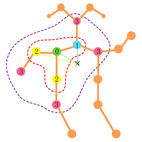 A good partition strategy can significantly improve model feature extraction capability. In order to make up for the lack of global information, a new partition strategy is used in this paper. We set the sampling function p to use the adjacent region with distance D = 2. It is divided into four subsets: (1) the root node itself (green dot); (2) the centripetal group (blue dot)—skeletal points that are closer to the center of gravity of the skeleton than the root node and that are adjacent to the root node; (3) the centrifugal group (yellow dots)—skeletal points further away from the center of gravity of the skeleton than the root node and adjacent to the root node; (4) the telecentric group (pink dots)—nodes at D = 2 from the root node. The partitioning strategy NEW-STGCN is shown in Figure 5. The purple dotted line part is the newly proposed extension region.