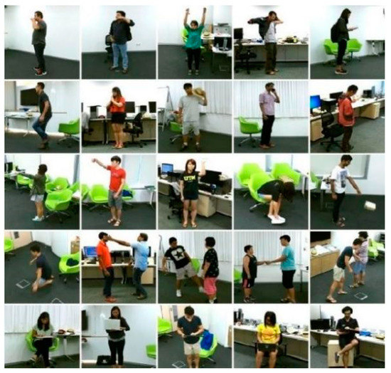 The NTU-RGB+D 60 dataset is a large dataset for human activity analysis. It contains 60 action categories with a total of 56,880 RGB+D video samples using Microsoft Kinect V2. Some sample data from the NTU RGB+D 60 dataset are shown in Figure 6. Every action video should not exceed two human skeleton sequences, and there are 25 key joints in each skeleton sequence.
