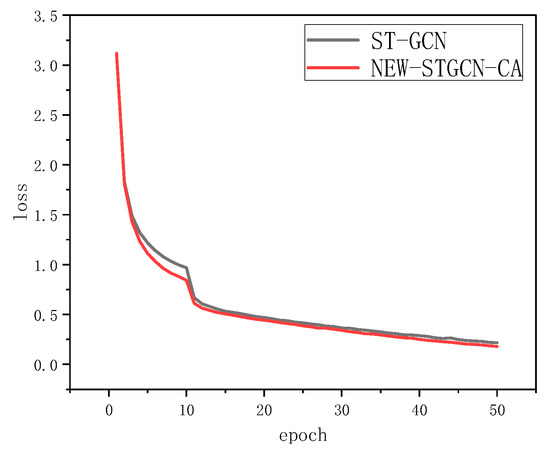 On the CS benchmark, the comparison of loss changes obtained by NEW-STGCN-CA and ST-GCN is shown in Figure 7, where both models converge. The NEW-STGCN-CA model converged faster than the ST-GCN model from the start of training until the epoch reaches 10, and the loss value was lower in the same epoch. Then the two curves gradually decreased, and the overall loss value of NEW-STGCN-CA was lower than ST-GCN.