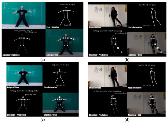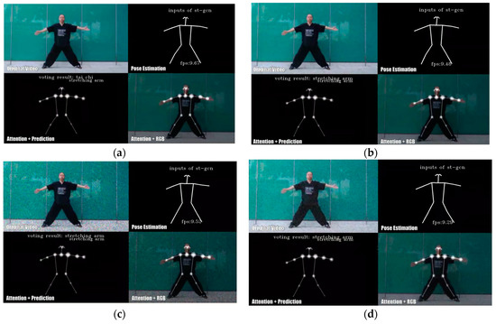Figure 8. Comparison of NEW-STGCN-CA and two-stream identification. Figures (a,c) show NEW-STGCN-CA and Two-Stream recognizing the stretching arm action in Tai Chi, and Figures (b,d) show NEW-STGCN-CA and Two-Stream recognizing the stretching leg action, respectively.