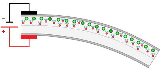 Ionic polymer–metal composite is composed of an ion-exchange (mostly cation-exchange) polymer membrane (ionomer) and metallic electrodes deposited on both surfaces of the membrane. The ionomer provides channels for selective ion migration and is mostly responsible for the mechanical properties of the IPMC. The metallic electrodes provide the applied voltage to the membrane surface and work as capacitor electrodes that can accumulate a certain amount of charge. The accumulated charge forces the ion migration in the membrane, which causes the bending of the IPMC actuators. Electroactive ionic polymers usually work in a humid environment and are driven by low voltages of 1–5 V. Inside the polymer structure, anions are clustered together to provide channels for the flow of the cations. When the material is hydrated, the hydrated cations diffuse under the influence of an electric field toward an electrode applied to the outer surface of a membrane. The accumulation of hydrated cations on the negative electrode side causes mechanical and electrostatic stress, which ultimately translates into the deformation of the IPMC actuator, as shown in Figure 2. The parameters of ion-exchange membranes, such as Young modulus, size of the ion-conducting channels, size of the counter ion (together with a solvation sphere), and the amount of absorbed solvent, as well as the insertion of different modifiers into the structure of the membrane, play a significant role on the final properties of IMPC. On the other hand, the conductivity of the electrode layer, their crack resistance during bending, and adhesion to the membrane surface are also crucial. Because the ion-exchange membrane and electrode properties mostly influence the IPMC parameters, two main routes of the IPMC modification can be distinguished. The first path focuses on the modification of the ionomer, and the second path focuses on the modification of electrodes.