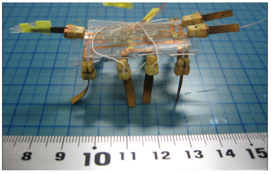 Figure 3 shows a prototype hybrid underwater soft biomimetic IPMC microrobot. The robot body was built with eleven IPMC actuators (two IPMC fingers, one tail, and eight IPMC legs) [42]. To date, multi-finger grippers that consist of two, four, and eight fingers have been produced. In [43] the authors proposed a three-fingered gripper in which each finger was an actuator, and each finger was actuated individually. As soft actuators, IPMCs can be applied in robotic optical systems, such as an auto-focus compact camera module and a tilting actuator for an endoscope [44,45]. Additionally, Tripathi et al. [46] developed an IPMC actuator that was used as a prototype for an active catheter-guidewire maneuvering application. The IPMC has some excellent characteristics for robotic applications compared with other soft polymer actuators as follows [47]: