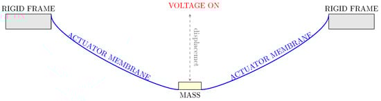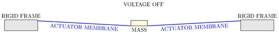 The principle of operation of the actuator is similar to the electromechanical transduction of a parallel two-plate capacitor. When an electric potential is applied across the polymer membrane coated with compliant electrodes on both sides, the material is compressed in thickness and expands in the lateral direction. This process is well explained in many publications [47,65,66,67]. Figure 5 and Figure 6 show graphically how the actuator membrane stretches under the influence of the applied voltage.