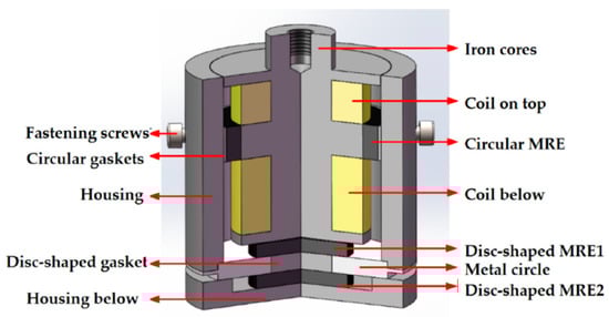 One of the most important applications of MREs is the vibration systems [113]. The property of variable stiffness under a magnetic field allows the construction of active vibration absorbers or insulators. The principle of the operation of absorber and insulator is presented in Figure 9. The construction of both device types has similar elements, however, their definitions are different. The main goal of these devices is to attenuate the vibrations. Firstly, the passive solutions were applied, which have constant frequency characteristics. This means that the operation can be desired for a specific frequency. The application of varying stiffness allowed extending the working range. This type of MRE application has been widely known for the last 20 years. In recent times, the new applications of absorbers are found in works [114,115,116]. The main feature of these applications is working in a high-frequency zone [114], extending with control systems based on the Hilbert–Huang transformation [115], designing torsional absorber for power train system [116], tuning to variable-frequency excitation [117,118]. The example of a vibration absorber is presented in Figure 10, which was presented in work [114]. Furthermore, the applications of insulators are also still developing as in [119]. In these devices, the new direction of research is designing advanced controllers like fuzzy PID [119], integrating the MRE insulator in new extended mechanical structures [120]. The example of an insulator is presented in Figure 11. Additionally, the MRE’s universality allows the building of custom MREs devices as in works [121,122,123,124], where the unique features of MREs allow to solve advanced problems from vibration control. From the authors’ point of view, the vibration control systems are well-analyzed with multiple applications.
