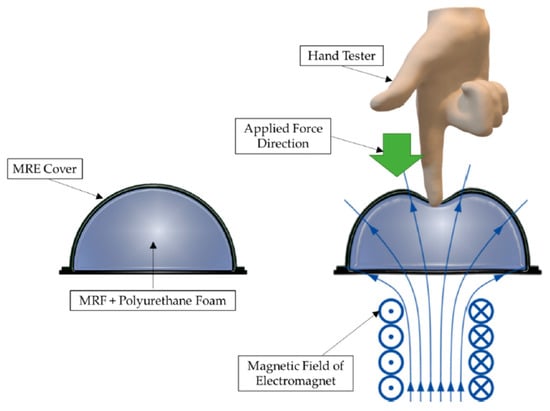 Alternatives to the vibration control systems presented in the previous paragraph are the MRE devices actuated to produce radial stretch, linear movement, or custom shape bending. In the group of devices using the radial stretch is the proportional valve presented in [2]. The linear movement can be applied in haptic devices to create varying stiffness buttons [2]. In this area, the recent developments are the application of MREs in robotics. The interesting applications are especially for grippers [125,126,127,128,129]. In the study [128], MRE and magnetorheological fluid (MRF) materials are used to prepare a universal gripper that enables catching various objects. In [130], the grippers with soft skin are prepared to allow for fitting the gripper finger to hold an object. In [126], the preliminary concept of the soft gripper is examined with fully soft fingers. In [127], the new MRE material prepared using direct ink writing 3D printing technology is applied to build the soft grippers activated with a magnetic field. An interesting application of MREs in robotics is proposed in the work [129], where the suction cup is created to build the climbing robot. Another application of MREs in robotics is haptic devices. The haptic devices are made in robotics systems to allow remote surgery [131,132,133], an example is presented in Figure 12. In our opinion, the use of MREs in robotics is currently being widely developed, and new types of applications are being sought.