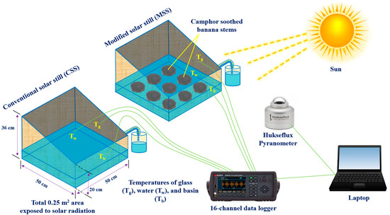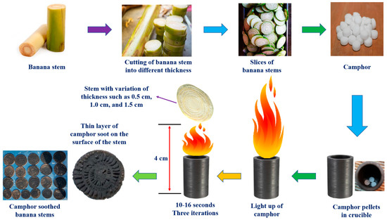 The studies were conducted in Hyderabad’s climate (longitude 78.49° E and latitude 17.39° N). Banana stems were taken and sliced into the desired thicknesses and soothed with camphor. The process of camphor soothing of the banana stems is described in Figure 2. Initially, fresh banana stems were considered and washed with distilled water several times to remove the surface impurities present on them. Later, they were sliced into several pieces (stems) with variation in the required thickness. The sliced stems were washed with deionized water to clean up the microstructure surface, to become ready for soothing and were dried at room temperature. After drying, the stems were exposed to camphor soothing. For soothing of the banana stems, we considered 5 gm of camphor and kept the stems at a height of 4 cm for uniform soothing. The camphor pellets were placed in a crucible and then ignited with a matchbox; the camphor pellets began to melt instantly. Camphor fumes were formed; they grabbed the flame and began to burn vigorously above the crucible. The flame height significantly decreased after 8–9 s, although it continued to burn around the crucible’s opening for 10–16 s. The banana stem was positioned over the top of the flame in order to deposit a thin layer of camphor soot on the surface of the stem. A single coating procedure iteration resulted in a very tiny film of camphor soot on the banana stems. Three such repetitions were performed, resulting in a clearly visible, thin soot coating on the stems. The process was repeated to sooth all of the banana stems with the required quantity to carry out the desalination experiment.