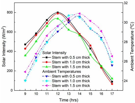 Solar irradiance is directly related to the ambient temperature of the environment. Solar irradiance is affected by wind speed and the values will be recorded with a lower value than the corresponding ambient temperature. The solar irradiance values were recorded on day 1 (with a 0.5 cm-thick banana stem) from 585 W/m2 at 10:00 a.m. to 89 W/m2 in the evening at 17:00 p.m. with a peak value at 12:00 p.m. as 800 W/m2. On day 2 (with a 1.0 cm-thick banana stem), the values ranged from 570 W/m2 at 10:00 a.m. to 60 W/m2 at 17:00 p.m., and at noon, the peak value of the day was achieved as 785 W/m2. On day 3 (with a 1.5 cm-thick banana stem), the values were recorded as 516 W/m2 at 10:00 a.m., 754 W/m2 at 12:00 p.m., and 110 W/m2 at 17:00 p.m. Similarly, the ambient temperature was 22–25 °C at 9:00 a.m. and reached a high of 30–33 °C around mid-day for all three days. On all of the days, the solar irradiance showed little variation, which concludes that all of the days had the same solar intensity conditions with minimal variation which was just negligible. The solar irradiance and ambient temperature variation for all three days are depicted in Figure 3.