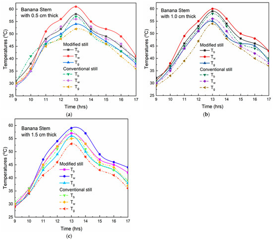 Using three distinct thermocouples, the temperatures of the water (Tw), glass (Tg), and basin (Tb) were monitored and are graphically depicted in Figure 4a–c. For the modified still, the maximum water temperatures were obtained at 61 °C, 58 °C, and 59 °C for the 0.5 cm-, 1.0 cm-, and 1.5 cm-thick banana stems, respectively. For the conventional still, the highest water temperatures were 56 °C, 54 °C, and 55 °C for all three consecutive days, respectively. Due to the presence of camphor-soothed banana stems, the temperatures of the water readings between the CSS and the MSS deviate from one another. More solar energy is absorbed by the banana stems in the solar basin, which leads to heat localization and transfers a significant amount of the energy flux from the sun to the water available on the surface of the banana stems. For the modified still with the 0.5 cm-, 1.0 cm-, and 1.5 cm-thick banana stems, the highest basin temperatures were 60 °C, 59 °C, and 57 °C, respectively, while for the conventional still, they were 57 °C, 58 °C, and 56 °C, respectively. This is owing to the energy interactions that occurred between the basin of the solar stills and the camphor-soothed banana stems. A maximum distillate yield was achieved by the improved evaporation rates, which were aided by the aforementioned water and basin temperatures. For the modified still, the highest glass interior temperatures were 54 °C for the 0.5 cm-, 55 °C for the 1.0 cm-, and 56 °C for the 1.5 cm-thick banana stems. The maximum glass interior temperatures for the conventional still were 52 °C, 54 °C, and 53 °C, respectively. Moreover, the evaporation of rate of saline water depends on the difference in temperature (Tw-g) between the water (Tw) and the glass (Tg). As this difference in temperature increases, the evaporation rate will also increase. This difference in the case of 0.5 cm and 1.0 cm was about 7 °C and 3 °C, respectively, in the MSS at the peak time. For the present study, the camphor-soothed stems absorbed the incoming solar energy and transferred it to the water surrounding them. As a result, the water temperatures are higher when compared to the basin temperatures in the MSS, whereas in the CSS, the basin temperatures are more in contrast to the water temperatures. For all three consecutive days, the highest temperature values were reached at mid-day and followed a similar pattern to the ambient temperature and solar irradiance.