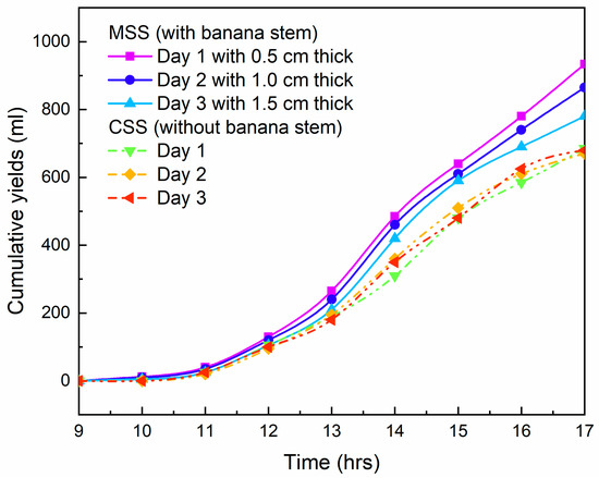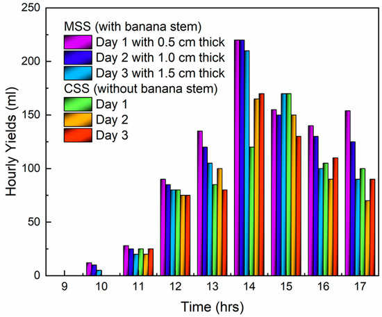With three different thicknesses of banana stems, the hourly yield and cumulative yield of both the CSS and MSS have been graphically depicted in Figure 5 and Figure 6, respectively. It is shown from the graphs that the distillate yield generated was more for the 0.5 cm-thick banana stems in contrast to the 1.0 cm- and 1.5 cm-thick banana stems. This is due to the capillary action of the banana stems. As the banana stem thickness increases, the time required for water vapor to reach the evaporation surface also increases. Another reason is that only a layer of water is available on the banana stem surface which rapidly evaporated as the camphor soothing of the banana stem readily absorbs energy from the sun. The maximum hourly water production was achieved at mid-day and those values were 0.88 kg m−2 h−1, 0.88 kg m−2 h−1, and 0.84 kg m−2 h−1 for the MSS and 0.48 kg m−2 h−1, 0.66 kg m−2 h−1, and 0.68 kg m−2 h−1 for the CSS for the 0.5 cm-, 1.0 cm-, and 1.5 cm-thick banana stems, respectively. The maximum hourly water purification production efficiency of 83% was attained for the 0.5 cm-thick banana stems in the MSS in contrast to the CSS. The conventional still produced 685 mL, 670 mL, and 680 mL of distillate on three different days, but the modified still produced 934 mL, 865 mL, and 780 mL of distillate with the 0.5 cm-, 1.0 cm-, and 1.5 cm-thick banana stems, respectively. The banana stem with a 0.5 cm thickness produced yields of 36.35%, 7.97%, and 19.74% more in contrast to the CSS for the studies of 1.0 cm and 1.5 cm thickness.