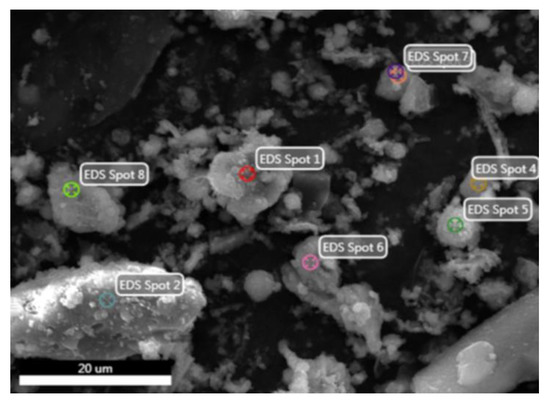 Table 7 are approximate but enable distinguishing the concentration points of crucial elements. The smallest fluffy-shaped particles mostly consist of CaO (spots 1, 5, 6, and 8 in