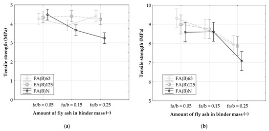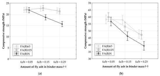 Figure 7a). With an increase in fly ash, the binder mass specimens with untreated fly ash showed a decrease in the 2-day compressive strength results. The activation of fly ash by sieving with the 125 or 63 µm sieve enabled utilizing up to 25% of fly ash in the binder without a negative influence on the 2-day compressive strength results. With the 90-day results, no detrimental effect was observed with the addition of up to 15% of either FA(B)125 or FA(B)63 fly ash (