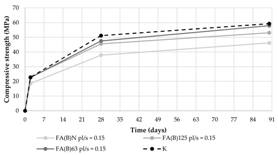 The dynamics of the increase in the compressive strength for specimens with a 15% amount of FA(B)63 fly ash in the binder mass was similar to the compressive strength increase in the control specimens (