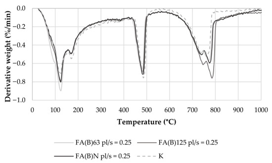 Figure 10) of FA(B)63 fly ash. In specimens with fly ash sieved through the 63 µm sieve, the peak at around 125 °C was around 12 p.p. bigger than for specimens with the respective amount of FA(B)N fly ash. The difference indicates a higher amount of C-S-H gel phase and ettringite in specimens with sieved fly ash.