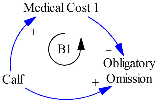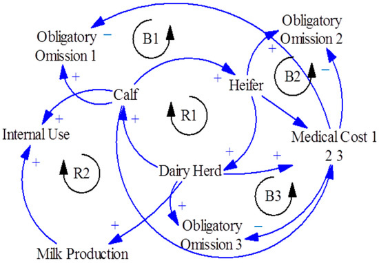 Of the different livestock classes, some livestock is removed due to different diseases and losses. This kind of loss not only affects the survival of the stockyard, but also results in increased medical costs. In each class, the common disease that causes the omission is related to infectious diseases as well as metabolic and digestive diseases. In Figure 1, the loops B1, B2, and B3, named as the control, protection, and development loops, respectively, indicate the relationship between the medical cost, obligatory omission, and the number of healthy livestock in its certain loop. Loop B1 is described as the sample. In Figure 3, with an increase in the number of calves, on one hand, the medical cost is increased for each calf, and obligatory omission takes place on the other hand. However, what causes the balance in this loop is the effect of medical costs on the decrease in obligatory omission, and thus they help to preserve healthy calves.