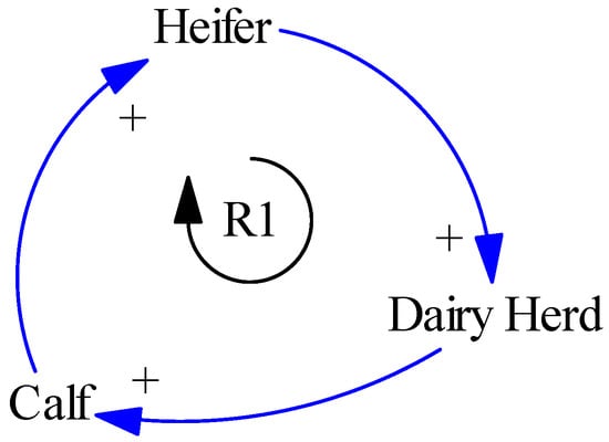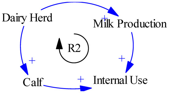 The central loop in the causal diagram as shown in Figure 2 is recognized as the ranch’s life loop. A part of the dairy herd is to breed, which consists of pregnant dairy cows and pregnant dry cows. Of the newborn calves, the female calves are considered as a heifer. The heifers, after calving, are considered as dairy milk. The flashes in this loop have been labeled as (+) indicating that with the increase and decrease of livestock in a group (dairy herd, calf, and heifer), another group also increases or decreases.