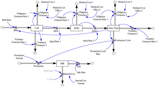 In the above-mentioned studies, the importance of the identification of different livestock diseases, demographic trends in livestock, use of management techniques, and even new technologies in milk production and the maintenance of livestock health was identified. However, as mentioned earlier, one useful technique in the field of livestock studies is to use a dynamic system [12]. Bastan presented an integrated and systemic model to analyze the existent dynamics in the sustainable development of Iran’s farming industry [21]. The dynamic systems portray the simulation of what is being done in the real world [14]; therefore using this management technique, an industrial ranch will be able to concentrate on important variables to increase milk production. After modeling the livestock population dynamics and considering the effect of disease and losses, along with the costs spent to reduce them, the management can then focus on the use of technologies, appropriate management techniques, optimization of the costs, and even the implementation of medical and animal tests on important variables to increase milk production.