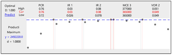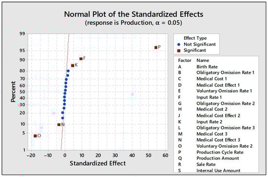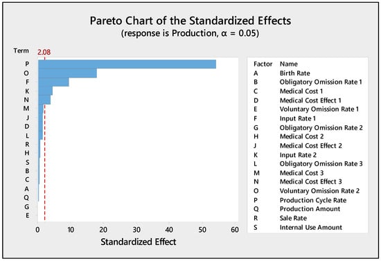 The number of auxiliary variables of the designed stock–flow diagram is equal to 18. These variables indicate the effective factors in milk production. To identify the important variables in the DOE technique, it is necessary to consider the high level and low level of each factor. These levels have been considered by collecting the ideas of five experts from different sections of the Fereidan Ahrar ranch and investigating the previous statistics. The given low and high levels are shown in Table 2. Figure 6 and Figure 7 show the results obtained from 40 experiments on the response variable of production in year 12. As can be seen in these diagrams, among the 18 auxiliary variables, the variables that were the most important in milk production were production cycle rate, voluntary omission rate 2, input rate 1, input rate 2, and finally the effect of medical costs 3, respectively. From these experiments, it can also be concluded that the obligatory omission was controlled in two classes of heifer and calf, and there was no need to spend more costs to control it. Therefore, it is important to control obligatory and voluntary omissions from the dairy herd.