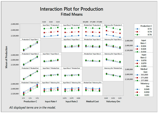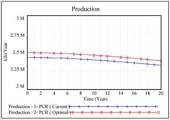 Figure 8 and Figure 9 show the results obtained from 243 experiments. Figure 8 shows the effect of the identified important variables on the production response variable. The interaction diagram shows the mutual effect of the variables on production. For example, with an increase in the production cycle rate from 0.72% to 0.76%, the average production also increased. The mutual effect of this variable aligned with input variable 1. This means that with an increase in the production cycle rate and input rate 1, the production rate increases. Figure 9 shows the optimal level of each variable for the maximum milk production. If these values are added, then the milk production rate as the response variable is equal to 249,220 kg in year 12. Different scenarios were defined according to these values. To define scenarios, the optimal values were entered into the stock–flow diagram and then their effect on the related flow variable and production response variable were compared. Figure 10 shows the effect of all of the optimal values compared to the initial values of the rate variables.