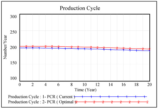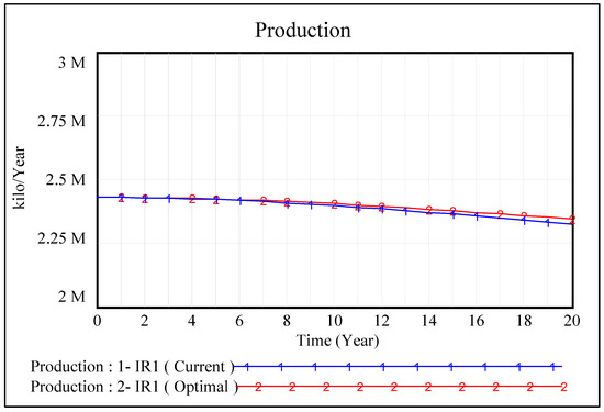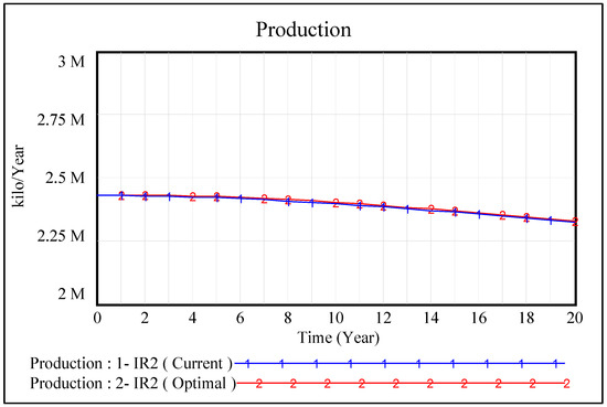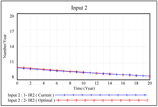 In order to obtain the optimal amount, the ranch needs to concentrate on reducing the calving to milking distance as well as the length of the dry period in the dairy cow. This was specified considering the biological factors of dairy cows such as sex, nutrition, etc. Therefore, the savings resulting from the medical costs in two classes of calf and heifer should be of focus in the expansion of this variable. Figure 12 and Figure 13 respectively show the effect of the current and optimal amounts of input rate 1 on the input flow variable 1 and variable of milk production response. Additionally, Figure 14 and Figure 15 are the effects of the current and optimal amounts of input rate 2 on the input flow variable 2 and milk production response variable, respectively. The optimal amounts of these four diagrams indicate the importance of heifers in the continuing process of ranch activity. Therefore, considering this class of livestock guarantees the future maximum milk production at Fereidan Ahrar ranch. As mentioned before, the results obtained from the analysis of the stock–flow diagram through the DOE technique in the first step shows the status control of the obligatory omission from this class. Therefore, the management should focus on reducing the time interval of exploitation from this class. On the other hand, policies such as purchasing new heifers will help to improve the input and output variables of this class of livestock.