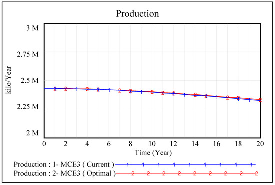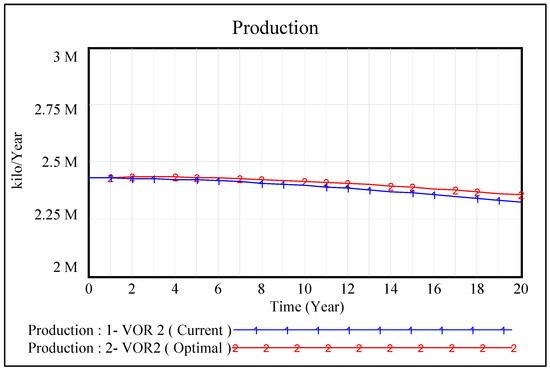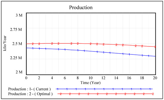 Finally, if the optimal values of all mentioned variables are included in the simulated model, then the comparison of milk production in the current state and the optimal state will be as shown in Figure 20.