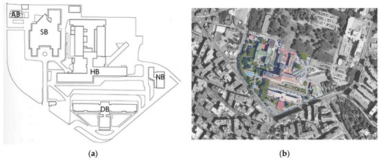 Pushover analyses for the main buildings of the institute “G. Pascale Foundation” in Naples have already been performed to accurately evaluate the seismic vulnerability, as presented in [17]. The medical complex is composed of five buildings: the “Scientific Building” (SB), the “Hospitalization Building” (HB), the “Day-Hospital Building” (DB), the “Administrative Building (AB) and the “Nun Building” (NB). (SB was not included in the seismic assessment.) A general plan of the institute is depicted in Figure 1.