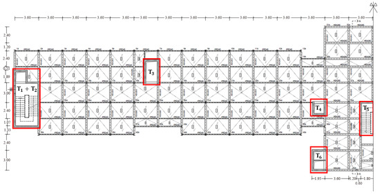 The building decks are composed of steel trapezoidal sheet running in the transverse direction, with a concrete topping of 50 mm thickness. The thickness of the trapezoidal sheet is 0.80 mm for spans up to 2.40 m and 1.20 mm for larger spans. The building deck is stiffened by a horizontal diaphragm constituting a bracing system made of steel angle sections (L40 × 40 × 4) (Figure 4b). The seismic-resistant part of the structure is composed of nine RC cores (serving as staircases and elevator cases) symmetrically located. On the left side, they are labeled T1 + T2, T3, T4, T6, while on the right side, the labels of the specular cores are the same but with an apostrophe (T1′ + T2′, T3′, T4′, T6′). T5 indicates the central RC core. The thickness of the concrete walls for all cores is 260 mm. In Figure 3, the extreme cores T1 + T2 (T1′ + T2′) have rebars with a diameter of 16 mm in the longitudinal direction, with 25 cm spacing (∅16/25). Meanwhile, the diameter of the other cores’ longitudinal rebars is 14 mm (∅14/25). In the transverse direction, in all the RC cores, the rebars acting as stirrups have a diameter of 8 mm, with 25 cm spacing (∅8/25). The rest of the platforms of the staircases were built as simple RC slabs, while the flat roof is a typical RC slab with lightning hollow blocks. The foundation systems are deep, built on bored piles with a diameter of 0.50 m and variable lengths. The depth of the concrete plinths is 1.20 m. The internal plinths are isolated, while the external plinths are connected by RC beams, supporting the external cladding, which is made of masonry-infilled blocks of 40 cm thickness. The foundation plan is shown in Figure 5.