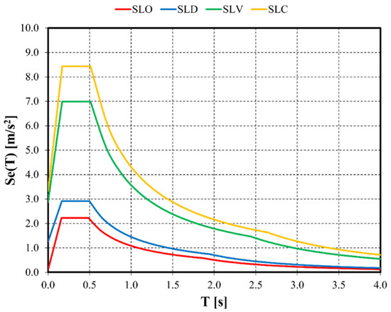 The coefficient is the PGA at the site, is the amplification factor and, finally, is a reference value to define branches the elastic spectrum. These parameters allowed us to determine the elastic response spectrum for each limit state, as shown in Figure 6. According to Section 7.3.6 of NTC2018, seismic verification was performed in terms of the resistance, for the limit states SLD and SLV, and we calculated the interstorey drift for the operational limit state (SLO). Moreover, the seismic verifications were evaluated according to the specific load combination reported in Section 2.5.3 of the Italian code [10].