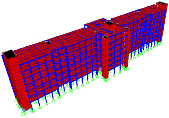 The numerical model was implemented in SAP2000 [21]. In particular, the steel members were modeled as beam–column elements. The beams have hinged connections at their ends; columns are continuous along their height. The walls, constituting the RC cores, were modeled by four-node shell elements. Moreover, the building decks were considered rigid diaphragms due to the presence of the concrete slab and the horizontal bracing systems. Finally, when considering the foundation properties, constituted by bored piles on a tuff bank, it was possible to assume a fully restrained condition for the building model. Figure 7 shows a view of the FE model. Subsequently, gravitational loads were assigned to the structure. Seismic actions were defined as response spectra along both directions according to the load cases. Then, the seismic combinations were defined according to the following relationship reported in Section 2.5.3 of NTC2018 [10]: