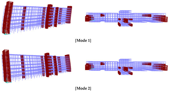The total number of mode shapes considered was 12, corresponding to effective modal masses of 98.023% and 95.754% along the x and y directions, respectively. Table 7 shows the dynamic characteristics of the structure. For each mode shape, the effective modal masses in both directions are reported. Furthermore, the first three mode shapes are shown in Figure 8.