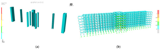 For the structural typology under investigation, the failure of steel members can be considered a brittle mechanism. Therefore, for such members, a behavior factor was used. However, all the safety checks concerning the columns were satisfied, and the demand-to-capacity ratios were less severe than those occurring under the gravitational load combinations. For these reasons, the results are not reported in the manuscript. Figure 10 shows two significant views of the obtained results. In particular, Figure 10a reports the demand-to-capacity ratios of the RC cores under bending and axial actions, while Figure 10b refers to shear actions.