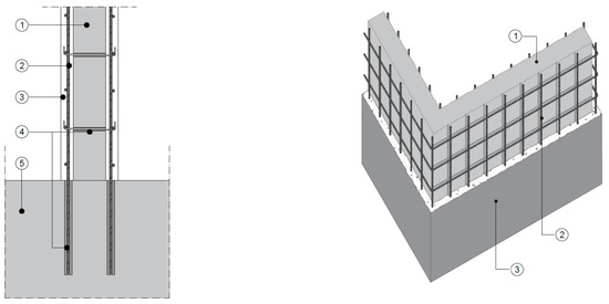 Construction details of the reinforced concrete jacketing. (1) Existing RC wall; (2) Rebars of the RC jacketing; (3) New concrete; (4) Detail of connection be-tween the new concrete walls and the existing foundation; (5) Existing foundation.
