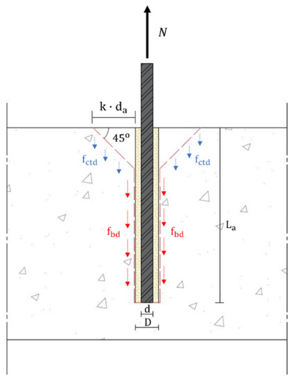 Regarding the connection between the new RC walls and the existing foundations, an epoxy resin was adopted as an anchor between the steel bars and the concrete with a design bond resistance () of 7.95 MPa. The anchor length of the steel bars was evaluated according to the following collapse mechanisms [25]: (1) yielding of the steel bar (); (2) radial collapse of the resin (); and (3) pull-out mechanism of the steel bar (). According to Figure 12, the following results: