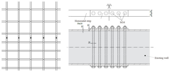 In the case of continuous steel plates, the minimum thickness is 10 mm, while the thickness of the horizontal strips ranges from 5 to 20 mm with . The spacing and the diameter of the threaded bars connecting the plate elements to the RC walls were determined to account for the buckling resistance under pure shear action. This buckling resistance was preliminarily evaluated by a FEM model of a square plate simply supported at the four corners and subjected to pure shear membrane forces. The minimum value of the spacing was 250 mm, while 8.8 class threaded bars (M16 or M24, as needed) were adopted for the steel connectors. Figure 13 shows the construction detail for the application of the continuous steel plate to the concrete wall. For single RC cores and for each story level, Table 13 reports information on the adopted steel plates and the horizontal strips in the case of total retrofitting (). Conversely, if a partial retrofitting is accepted (), for the cases reported in Figure 14, information on the structural detail is given in Table 14. Vertical steel angles 260 × 260 × 10 created by welding are located at the corners, while the vertical strips overlap the horizontal battens, connected by means of threaded bars, as shown in Figure 15.