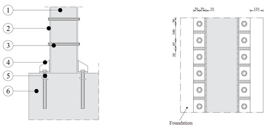 Construction detail of the connection to the foundation. (1) Existing RC wall; (2) Steel plates; (3) M16 bolts; (4) Stiffening plate with height of 120 mm; (5) Anchor bolts (M20 or M24); (6) Existing foundation.