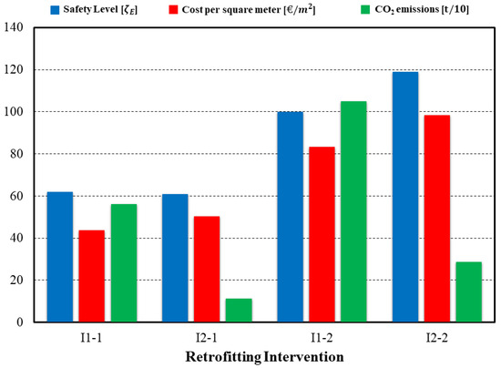 Regarding the environmental impact of these structural interventions, an assessment was carried out in terms of emissions. According to the life cycle impact assessment (LCA) [32], only the production stage (named “cradle to gate”) were considered. Three sources of emissions were considered: raw material supply (A1), transport (A2) and manufacturing (A3). For the production stage, the global warming potential parameter (GWP) was derived from environmental product declarations (EPDs). This parameter expresses the amount of emitted per ton of material. The values of the GWP parameter considered in this work are reported in Table 18. The manufacturers that provided the EPDs are indicated in [33,34,35,36]. The total values of emissions for each intervention are reported in Table 18. It is interesting to observe that the interventions based on the use of steel plates (I2-1, I2-2) provide a reduction in the emissions of about 70% more compared to the interventions using reinforced concrete (I1-1, I1-2). Figure 17 shows a summary of the results for our comparison of the proposed retrofitting interventions in terms of structural performance, financial costs and environmental impact. When comparing the interventions I1-1 and I2-1, no significant differences are expected for emissions, whose values are very high, especially in the case of intervention I1-1. Meanwhile, in the case of safety level , intervention I1-2 is economically more advantageous than intervention I2-2, but it is less environmentally sound.