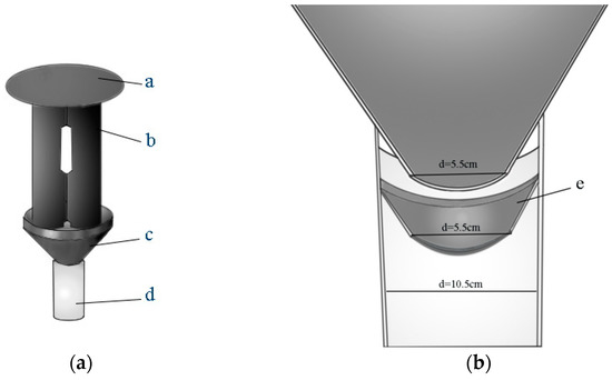 (a) The black cross-vane trap; (b) trap funnel and collection cup section. a: circular top; b: cross-shaped panel; c: funnel; d: collection cup; e: anti-escape ring.
