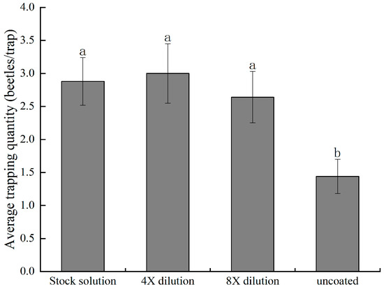 Effect of Teflon concentration on trapping of Monochamus alternatus in Jiaxing. Different letters on bar top indicate significant differences between treatments. (α = 0.05).