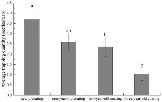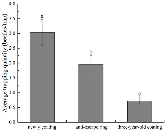 In order to study the trapping efficiency of the anti-escape ring on M. alternatus, we compared the trapping efficiency of old traps with and without the anti-escape ring, respectively. The results showed that the trapping results of each treatment showed a significant difference (Figure 4; F = 13.56, df1 = 2, df2 = 72, p < 0.05). The trapping efficiency of the old traps with an anti-escape ring significantly increased by nearly three times as much with the mean of 1.96 ± 0.29 beetles/trap compared to that with three-year-old Teflon coating without an anti-escape ring, with the mean of 0.72 ± 0.14 beetles/trap. The anti-escape ring significantly improved the trapping efficiency of the old traps with the three-year-old Teflon coating on M. alternatus (p < 0.05). However, traps with new coating still showed the highest trapping efficiency of M. alternatus, and there was a significant difference in the trapping efficiency between the traps with a new coating (3.04 ± 0.44 beetles/trap) and the old traps with an anti-escape ring (p < 0.05).