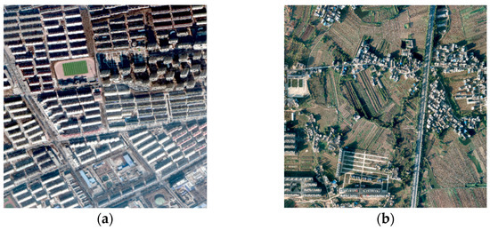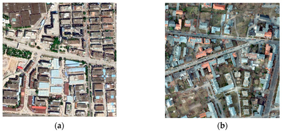In this experiment, two images with relatively larger areas (about 1 km2, 5201 × 5201 pixels) and with a spatial resolution of 0.2 m are used as two different target domains. The first image represents an urban area and is obtained from Google Images at Jilin, China, where the building types include residential areas, educational sites, industrial sites, and so on. The second image represents a suburban area and is also obtained from Google Images at Yunnan, China, in which the buildings are mainly low single bungalows. Their details are shown in Figure 4. The UNet-based pre-trained model by the IAILD dataset in experiment I is also used for the pre-trained model in this experiment.