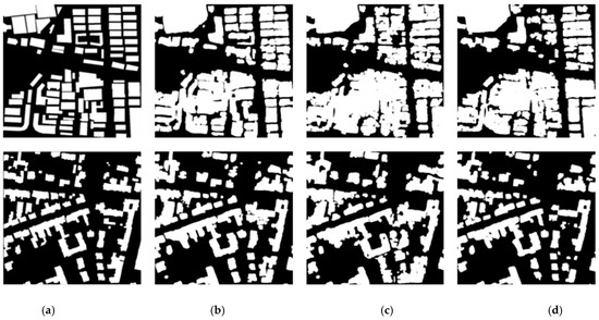 Semantic segmentation results of our framework with three different models in two different target domains. The first and second rows correspond to the results of the first image and the second image, respectively. The white area indicates the building footprint. (a) Ground truth. (b) Results of our framework based on UNet. (c) Results of our framework based on PSPNet. (d) Results of our framework based on LinkNet.