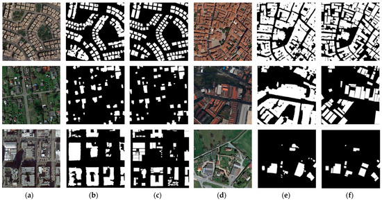 Some building extraction results on WHU Satellite Dataset I. The white area indicates the building footprint. (a,d) are the remote sensing image. (b,e) are the extraction results of our framework with the UNet model. (c,f) are the ground truth.