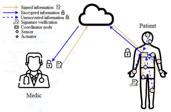 A wireless body area network (WBAN) is a wireless network of heterogeneous sensors placed in different parts of a human body [1]; the sensors can be wearable or implanted under the user’s skin. WBANs will be relevant and helpful for monitoring the population’s health. WBANs can be used not only on remote patients but also to enable the wireless monitoring of patients within hospitals. According to the World Health Organization (WHO), between the years 2000 and 2050, the population over 65 years old will go from 605 million to 2 billion people [2]. WBANs use low-power signals to reduce interference between devices, and the transmission distance is not greater than 2 or 3 m. Thanks to this, doctors can monitor patients’ health in real-time; thus, their health records are always up to date. The Health Insurance Portability and Accountability Act (HIPAA) provides a series of regulations on securing a patient’s information [3]. In such regulations, it is stipulated that privacy and confidentiality are essential characteristics to have on monitored patients. Despite this, security is often overlooked, and patients could be exposed to a cyberattack that could put their health and life in danger. In this context, several cryptographic protocols have been proposed that ensure authentication and only use confidentiality and integrity as support for maintaining authentication.