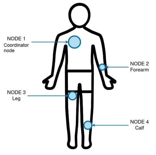 The security levels and protocol parameters are agreed upon in the initial phase. In the same way, the sensors and actuators must be registered with the coordinator node and later with the server. In this way, both the server and the coordinating node know the identities of all the sensors and actuators participating in the WBAN. From this moment, the communications of A with C and D must be through B. However, it is known that one of the most vulnerable aspects of WBANs is wireless communication since it can allow unwanted third-party entities to transmit information passing through authentic sensors. Therefore, it is necessary to provide a method to authenticate corporal sensors. The proposed method is based on the use of the acceleration vector and gyroscope correlation-based authentication proposed in [36]. This method uses a coordinator node (CN) and different sensor nodes; each has a 3D-axis accelerometer and a 3D-axis gyroscope. Sensors are placed on different parts of the patient’s body to measure patient-specific physiological data and transmit them to the CN that is placed on the chest. The location of the sensors is shown in Figure 3. The authentication process begins with the sending and receiving of information, where the CN analyzes the received data. For this, the information provided by the accelerometers of both parties is used. To carry out authentication, this method calculates the correlation between the accelerometer data flow of the new sensor and the coordinator node. If the sensor and the coordinator node are in the same body, the magnitude of the accelerometer vector will be highly correlated. The method will approve the connection if the correlation value is high between them, otherwise, it will reject it. Figure 4 presents the flow diagram of the proposed authentication method.