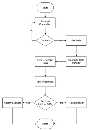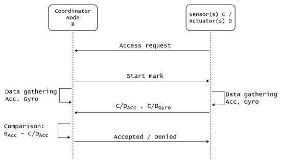 Algorithm 1 presents the authentication process described in [36], where b is the new detected sensor. and are the accelerometer and gyroscope readings of the CN and the sensor, respectively. , are the results of the calculation of the correlation between the data of the CN and the sensor using the accelerometer and the gyroscope measurements, respectively. is the decision limit to accept the sensor or reject it. If the sensor is accepted, it can freely send data to the CN; if rejected, the sensor is deleted, and access to the network is denied.