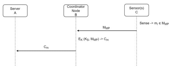- Phase 2—Sensing, encrypting, and sending information: C sensors register and send the encrypted information to B.